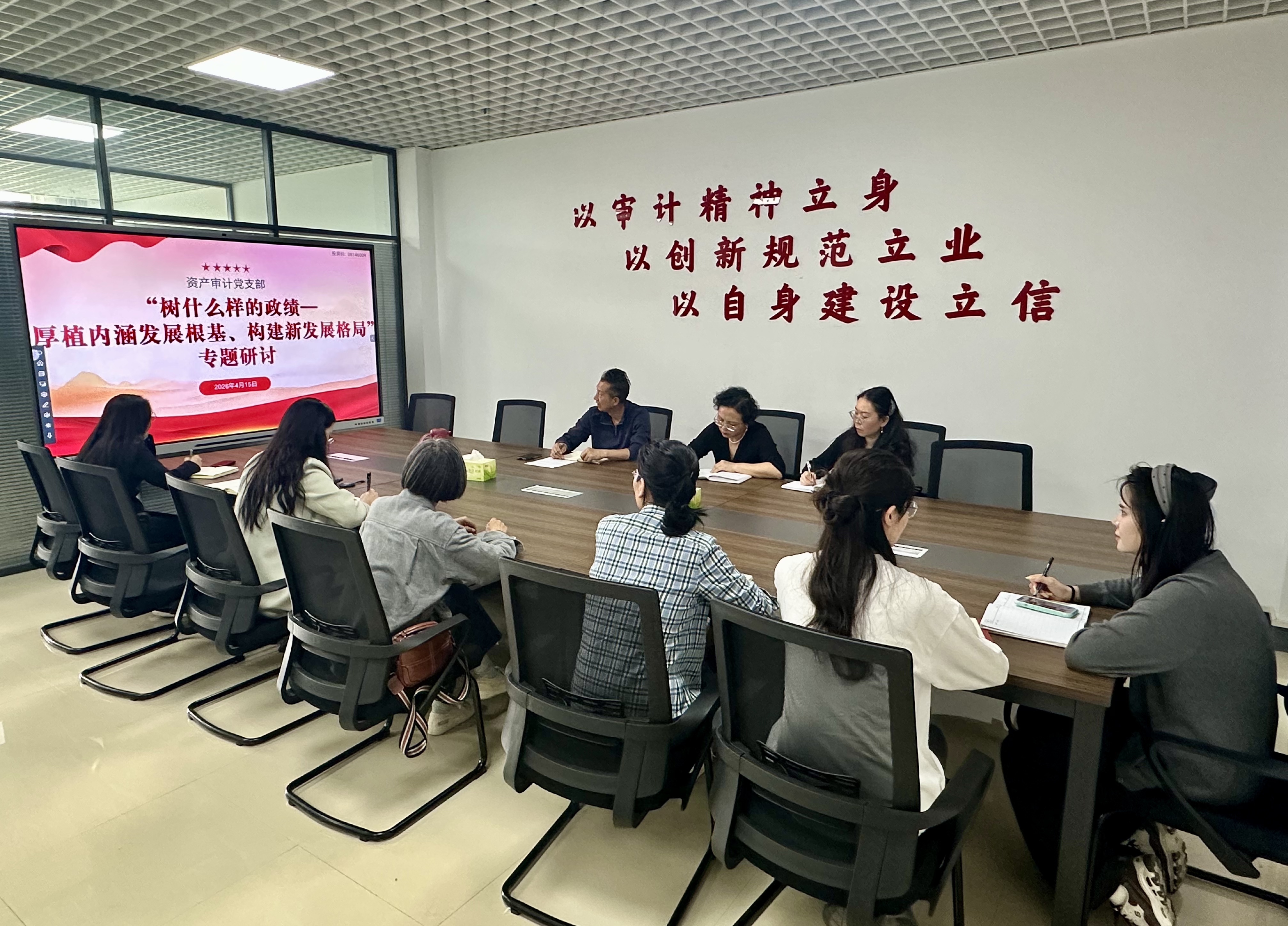 4月15日,为深入学习贯彻习近平新时代中国特色社会主义思想,全面落实党中央关于树立和践行正确政绩观的部署要求,资产审计党支部围绕“树什么样的政绩——厚植内涵发展根基、构建新发展格局”主题开展专题学习研讨。研讨活动由党支部书记陶文信主持,全体党员参加。